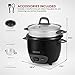 - Accessories – Includes a full-view tempered glass lid, aluminum steam tray, rice measuring cup, and serving spatula. Power consumption: 120V/60Hz 350W