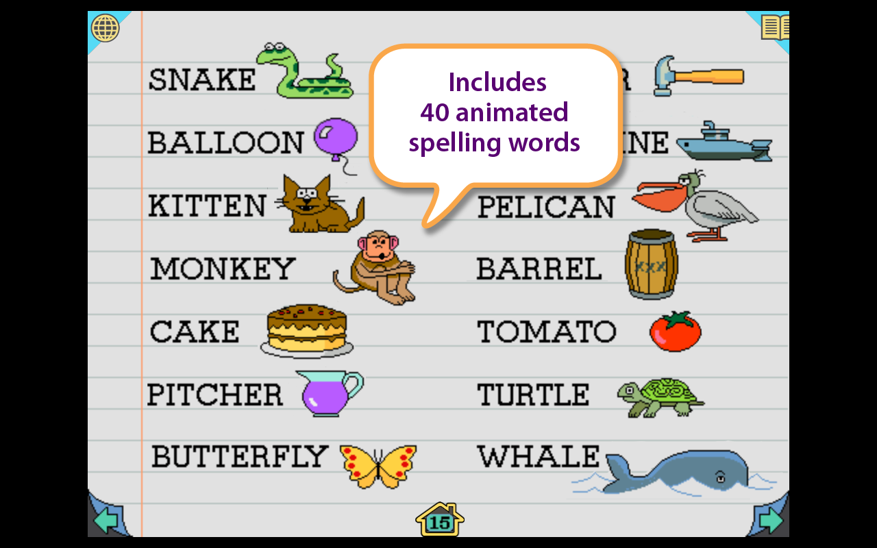 • 40 interactive spelling words, each fully animated to reinforce the word meaning