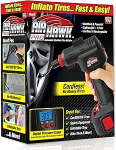 Digital LED pressure gauge reads pressure and automatically shuts off when it reaches desired tire pressure. Simply squeeze and release locking trigger to begin inflation! Air Hawk Pro includes a flexible 5" long air hose with thread connector to ensure a proper seal with valves. Pin Attachments also included for balls or inflatable toys! Air Hawk Pro runs on a rechargeable battery. It comes with a 12V cable adaptor for continuous use and an 11’ long car adapter. Charge at home or on the go! Compact, Portable and light-weight, Air Hawk Pro is the perfect for travel. You can easily store in your glove compartment, toolbox, trunk, garage or roadside emergency bag. Built-in LED light illuminates tire valves – perfect for inflating low tires during nighttime roadside emergencies!