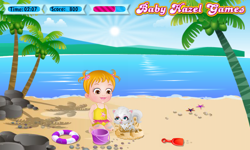 Baby Hazel is playing at the beach along with her pet cat, Katy. Do you want to enjoy beach time with them? Go along but make sure Hazel does not get inside the water without safety gears.