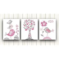 Girl Nursery Wall Art Pink and Gray Decor Birds Flowers Whimsical Tree (Set of 3 Prints UNFRAMED)