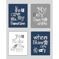 Elephant Art, You are my sunshine Navy Blue and Gray Art Prints, Navy Nursery Decor, Navy Blue Nursery Wall Art, 4-8x10 PRINTS ONLY, Unframed. (NOT CANVAS)