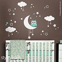 Owl Wall Decal, Owl Wall Sticker, Moon Stars Clouds Owl Wall Decal for Nursery Decor Baby Room Owls Kids Wall Decal