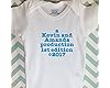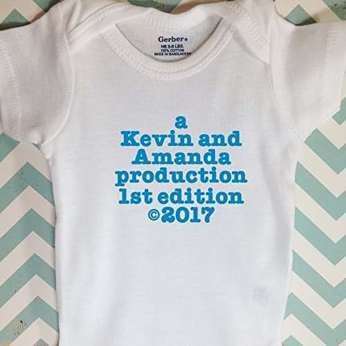 Baby onesie with couple's names and "Production Edition" number. Cute and unique baby gift idea for that couple who has just about everything.