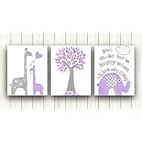 Girl Nursery Decor Purple Grey Animals Elephant Giraffe with Quote (Set of 3 Prints UNFRAMED)