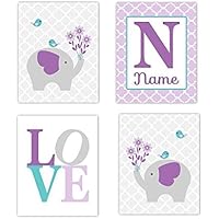 Baby Girl Nursery Wall Art Elephant LOVE Purple Lavender Teal Aqua Personalized Name Art Baby Nursery Decor Girl Room Print SET OF 4 UNFRAMED PRINTS