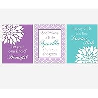 Baby Girl Nursery Wall Art Purple Lavender Teal Floral Flowers Dahlia Mums Bursts Beautiful Prettiest She Leaves a Little Sparkle Toddler Bedroom Baby Nursery Decor SET OF 3 UNFRAMED PRINTS