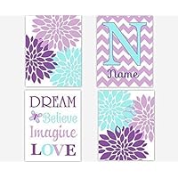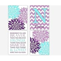 Baby Girl Nursery Wall Art Purple Lavender Aqua Teal Blue Flowers Burst Mums Dahlia Personalize Braver Stronger Smarter Loved SET OF 4 UNFRAMED PRINTS