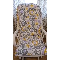 READY TO SHIP Two Piece Cushion Set for Glider or Rocking Chair in Suzani Geometric Yellow Grey and Lavender, Wisteria, Lilac, Purple on White Background
