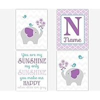 Baby Girl Nursery Wall Decor Purple Lavender Teal Aqua Elephant You Are My Sunshine Personalized Name Art Baby Nursery Decor Girl Room Print SET OF 4 UNFRAMED PRINTS