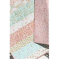 Shimmer Baby Quilt, Girl Crib Bedding, Blanket, Gold Striped, Coral Pink Light Blue Nursery Decor, Brambleberry Glitz