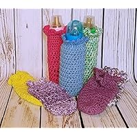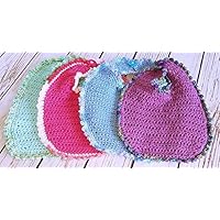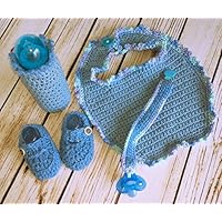Just in time for Spring. Adorable baby gift set all in blue. Cotton and Acrylic yarns. Set includes bib, pacifier clip and pacifier, baby loafers, and baby bottle cover.