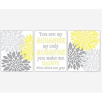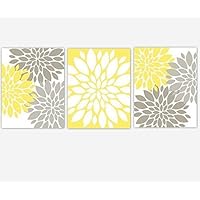 Yellow Gray Grey Flower Burst Dahlia Mums Modern Floral Bedroom Girl Toddler Tween Room Baby Nursery Decor SET OF 3 UNFRAMED PRINTS