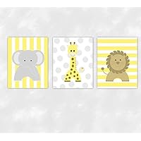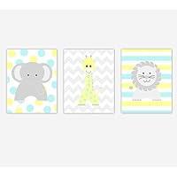 Baby Nursery Artwork Yellow Blue Aqua Teal Gray Grey Elephant Giraffe Lion Safari Jungle Animals Baby Nursery Decor SET OF 3 UNFRAMED PRINTS