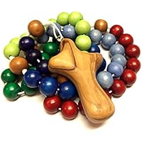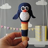 Baby Rattle Penguin, Personalized, Eco Teether for Toddler, Handmade Teething Toy, Height 5.5 inches (14 cm), Organic Cotton Yarn, Wooden Bead