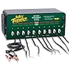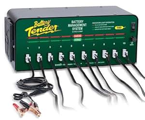 | The Battery Tender 12-volt/2-amp 10-Bank Battery Management System is designed for commercial use in keeping up to 10 12-volt batteries simultaneously charged and maintained, each at its proper storage voltage without the damaging effects caused by some trickle chargers. Compatible with all AGM (absorbed glass mat), sealed maintenance free and flooded batteries commonly found in everything from some automotive/farm equipment to motorcycles, ATV’s, and personal watercraft, this lightweight, microprocessor controlled unit provides safe, constant, 4-step charging current for every vehicle stored in your shop. Simultaneous charging of up to 10 separate batteries. View larger. | The 4-step charge cycle detailed. View larger. | Smart, Commercial Grade 4-step Battery Charging The first fully automatic, constant-current battery charger designed to charge and/or maintain up to 10 12-volt batteries simultaneously at 2 amps, the Battery Tender 12-volt/2-amp 10-Bank Battery Management System utilizes a 4-step charging program (initialization, bulk charge, absorption mode and float mode), that allows users to connect the charger to up to 10 batteries, either in or out of a vehicle, with the confidence that all are being maintained at optimal performance levels. This makes it extremely useful for battery rotation, where a battery is removed from service during repair or in preparing batteries for sale. It is also safe for your batteries, with the built-in ability to automatically switch its output voltage to a storage or float level that eliminates the need to worry about the damaging effects of overcharging, and the resulting need to check on the condition of a charging battery. If or when the battery voltage drops too far under load, this same smart technology resumes output power and the charging cycle begins again. The unit also features sparkproof connectors, reverse polarity protection, a 72-hour safety timer that ensures batteries attain float mode status during charging, an easy to understand charging status LED indicator for each charging bank, durable construction and almost no current draw from batteries connected to it. Key Features: - Simultaneously charges and/or maintains up to 10 12-volt batteries.