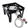 - 1-piece welded steel frame, 14-inch diameter cooking surface, wide-set legs for stability.The flame on this high pressure propane burner is adjustable, therefore you can obtain a roaring flame or turn the flame down small enough simmer a cup of coffee