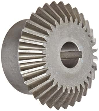 This steel Boston Gear HLK series miter gear has a 20 degree pressure angle (PA) and a straight miter to transmit torque between perpendicular shafts to provide rotational power to another part of a motorized system. This gear has a keyway and setscrew for use with a keyed shaft, is made of low carbon steel (.2 percent carbon), and has hardened teeth for 1:1 gear ratio applications where hardness and strength are needed to transmit torque and motion. The 20 degree pressure angle provides a lower contact ratio between gears than a 14.5 degree pressure angle, resulting in higher load capacity. This gear is intended for use only with identical gears because miter gears can mesh only with gears that have the same pressure angle, number of teeth, and diametral pitch (number of teeth per inch). This Boston Gear miter gear is suitable for use in a variety of commercial and industrial applications, such as construction equipment, aeronautics, conveyors, and manufacturing equipment, among others.