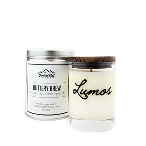 On a winter afternoon, during a long and difficult school year, you decide to skip class...just this once. Using your magical map, you and your friends manage your mischief and make your way to the nearby town, where you settle into a cozy pub for some foaming sweet mugs of hot Buttery Brew. The aromas of buttered rum, spice and vanilla will always bring you back to fond memories of good company and a little bit of mischief. Buttery Brew is also available as an 8oz Travel Tin Soy Candle and 4oz Room Spray. Looking for similar scents? Be sure to check out Pumpkin Juice, Dark Magic, and Wizard's Holiday. Details: - Made using all natural soy wax, cotton wicks, and no dyes. - Each candle is a 14oz. double old fashioned glass. - Topped with a wood lid to help scent last longer. - Burn time is approximately 70-75 hours. - Each candle comes packaged in a 1-quart silver tin can. When finished burning your candle, wash the glass with warm, soap water. You then have a re-usable drinking glass. The printed black ink is permanent and will not fade or wash off. While we recommend washing by hand, this glass is dishwasher safe. The wood lid makes a great base for your candle or a coaster for your glass, and the tin can makes a great storage container.