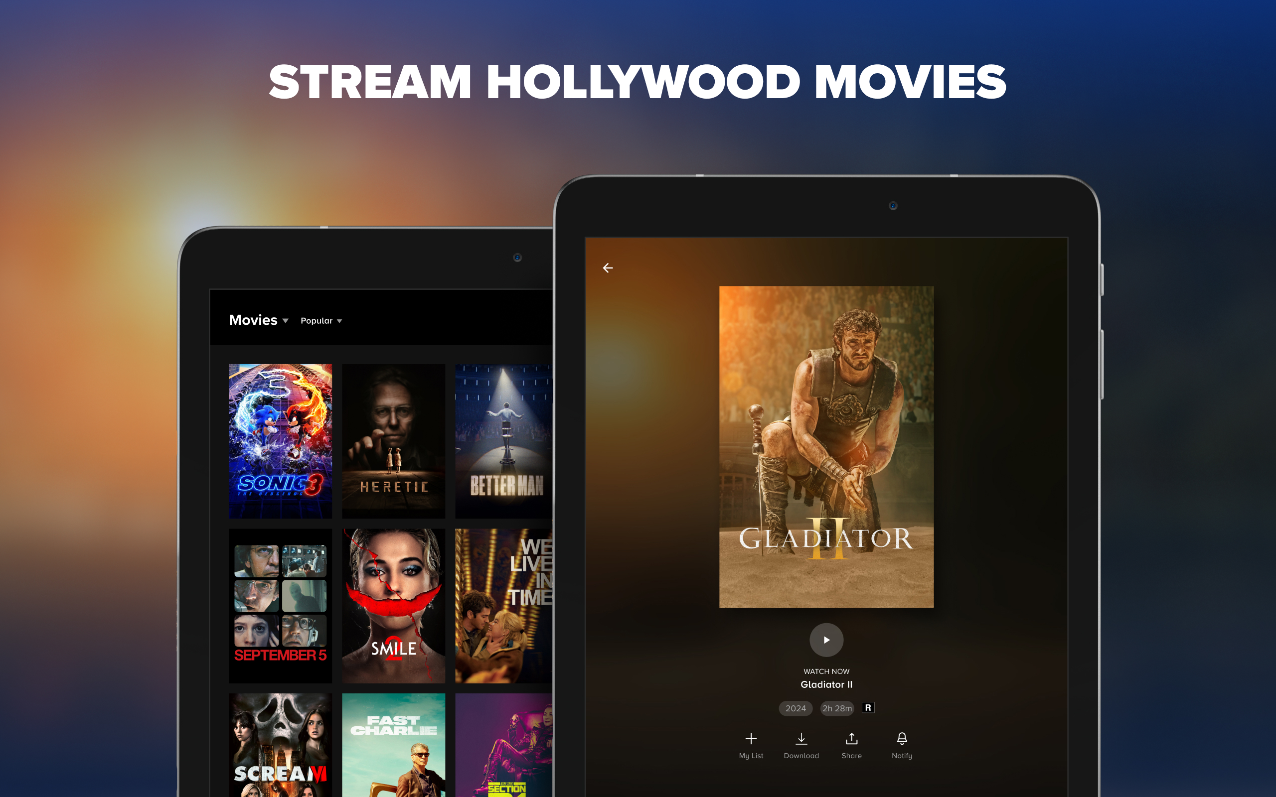 Hollywood blockbusters that make every night a movie night, with new & exclusive premieres plus hundreds of hits and award-winning classics, including Gladiator II, Sonic the Hedgehog 3, and Heretic.
