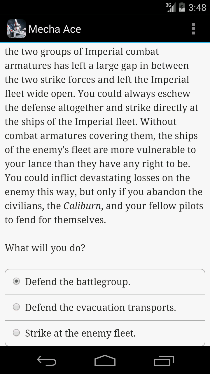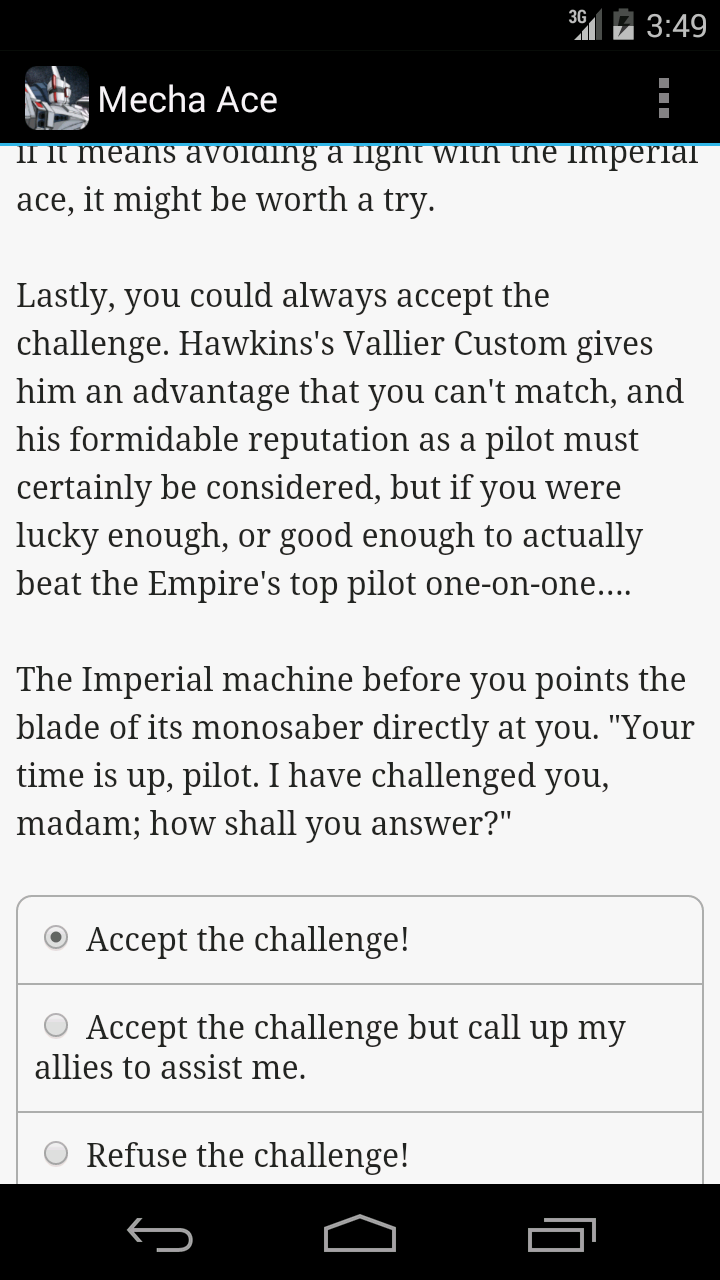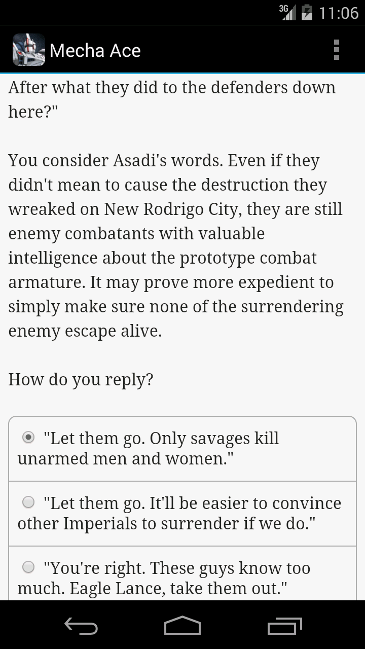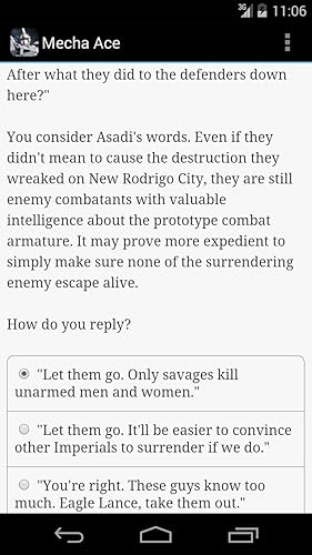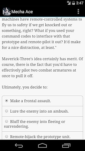 Anyway, as my title says, I really wanted to like Mecha Ace. I read 9 episodes before I gave up on the book. I'm assuming there are 10. I try to play Choice of Games titles (and other RPG games, like on Xbox, Playstation, or PC) as if I am playing it true to how I would act in real life. I don't try to be necessarily "good" or "bad," Paragon or Renegade if you will, but I just try to be fair and decent and choose to do what makes sense at the time. I find that makes me happy, playing a role that makes me feel like I am me being thrust into extraordinary situations... as opposed to playing as a different person altogether.