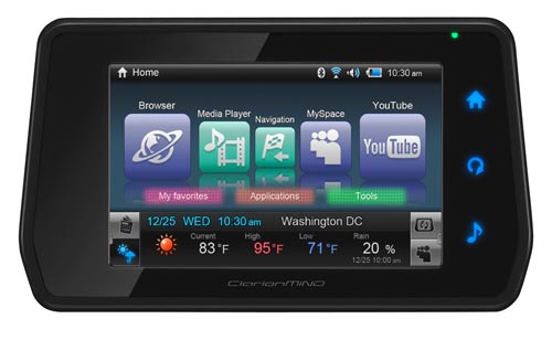 ClarionMiND is a completely new type of mobile Internet device created by the car audio and navigation expert Clarion. As a Next Generation Navigation plus Internet-Based Entertainment device, it provides GPS navigation, and with Wi-Fi and Bluetooth-enabled cellphone, the Internet can be accessed via a full browser anytime and anywhere. ClarionMiND has a new interface that allows you to navigate the real-world and the unlimited possibilities of the Internet at the touch of a finger. Standard Features: Available in Black, White and Red; 4.8-inch TFT WVGA Touch Screen; Built-In Navigation; Built-In WiFi; Stylus and Quick Reference Guide; Li-Ion Rechargeable Battery; Cigarette lighter and AC Adapter; Windshield Mount Kit. Hardware: Intel Atom Processor Architecture; 4.8 inch WVGA(800x480) Widescreen LCD Display with touch screen; Simple Three Buttons (Home, Control,Audio); Built in stylus holder; Headphone Jack; Built-In Speaker / Amplifier; Inter-changeable Li-Ion Battery and extended battery is available as an option. Storage: 512MB DRAM; 800MHz Clock Speed; 4GB Solid-State memory for Storage. I/O: MicroSD Card Slot; 2 USB Port (Standard 2.0/Mini); Built-In WiFi b/g; Built-In Bluetooth 2.0 EDR for Dial-up Networking (phone tethering) uses phone as a modem; Built-In SiRF GPS III 20-Channel GPS Antenna/Reciever; USB media control to external MP3 thru RealPlayer; Docking Station Connector for optional NK1. Dimensions: 6.61in(W) x 3.78in (H) x 1.06in (D) with Standard Battery; 6.61in(W) x 3.78in (H) x 1.42in (D) with Large battery (Option); Total Weight : With Standard Battery: 11.64oz With Large Battery: 13.76oz (Option.