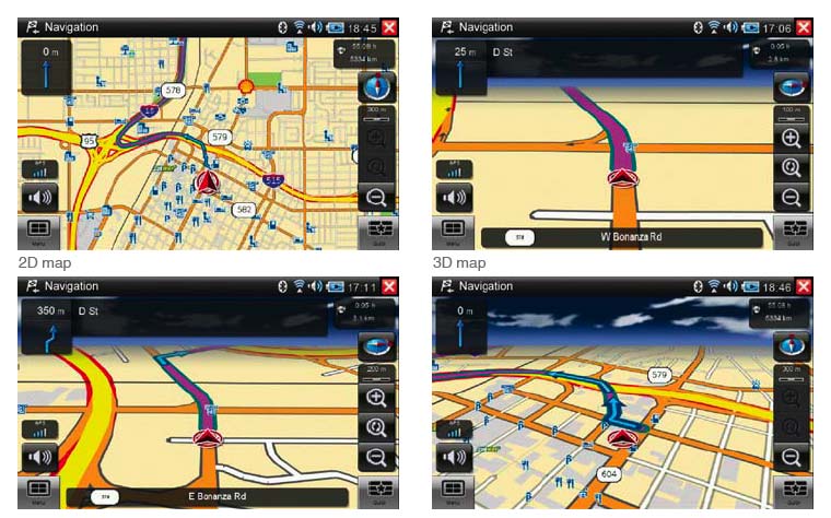 - Pre-loaded with Navteq maps and 2 million POIs for U.S. and Canada; send Google Maps information to device; 2D and 3D map views