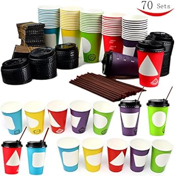 70 Coffee Cups with Lids - 12 oz Disposable Paper Coffee Cups with Lids - To Go Coffee Cups - Party Favor