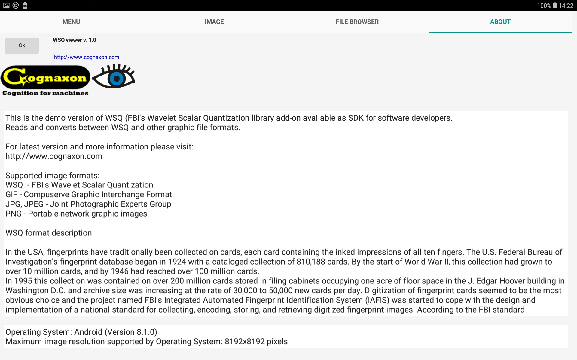 Opens WSQ (FBI's Wavelet Scalar Quantization) and other image file formats.