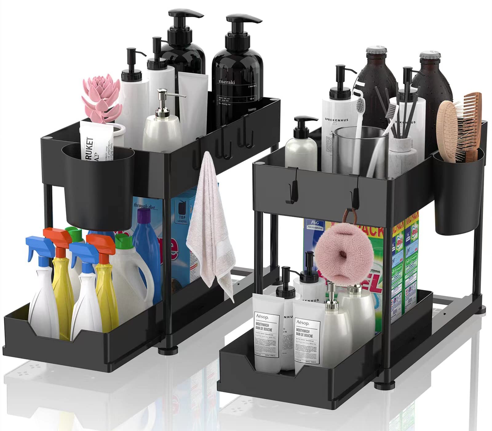 XHKJFM 2 Tier Under Sink Organizers and Storage, 2 Pack Under Sink Organizer Kitchen Bathroom Under Sink Cabinet Organizer with Sliding Storage Drawer, Hooks, Hanging Cup, Black