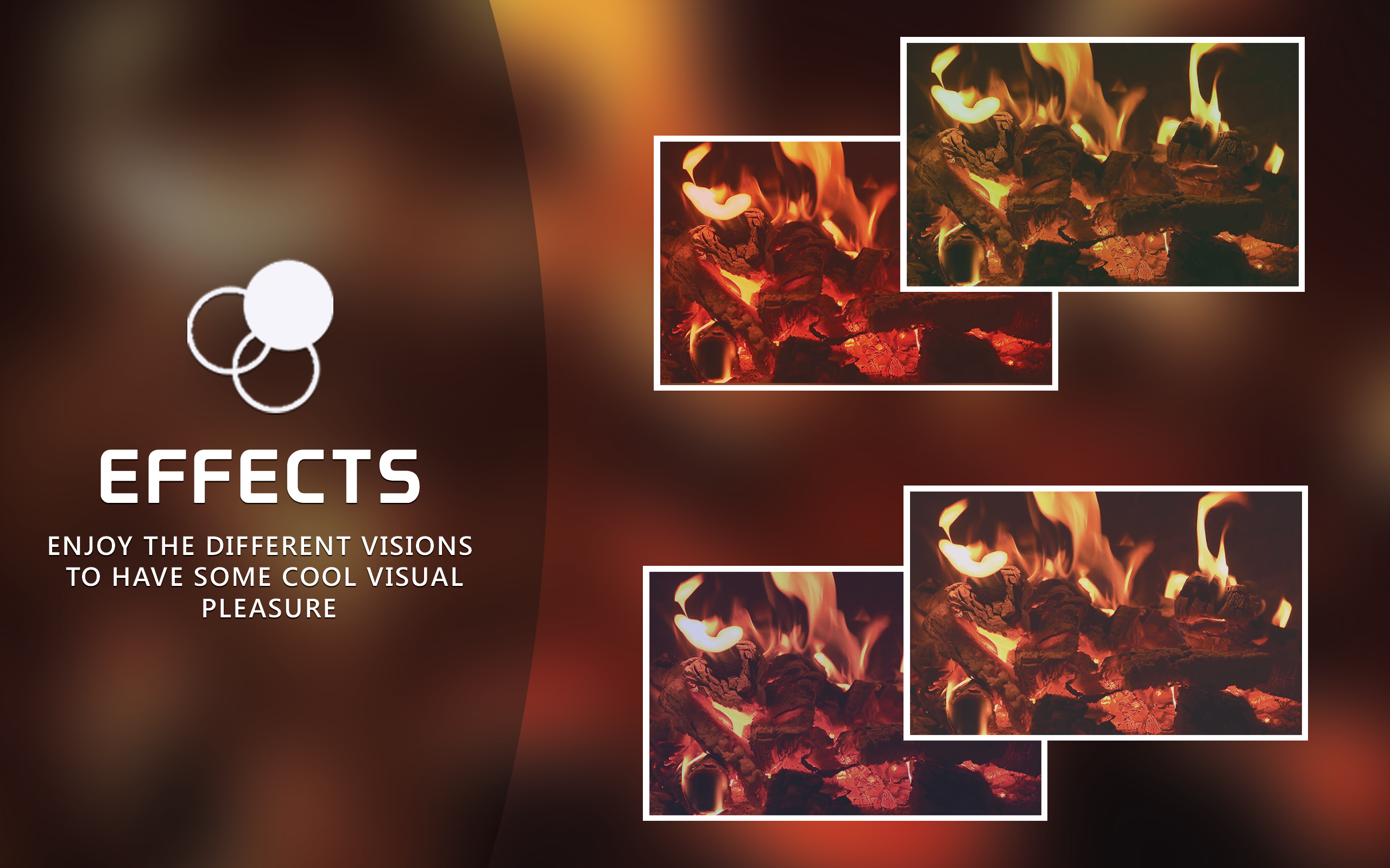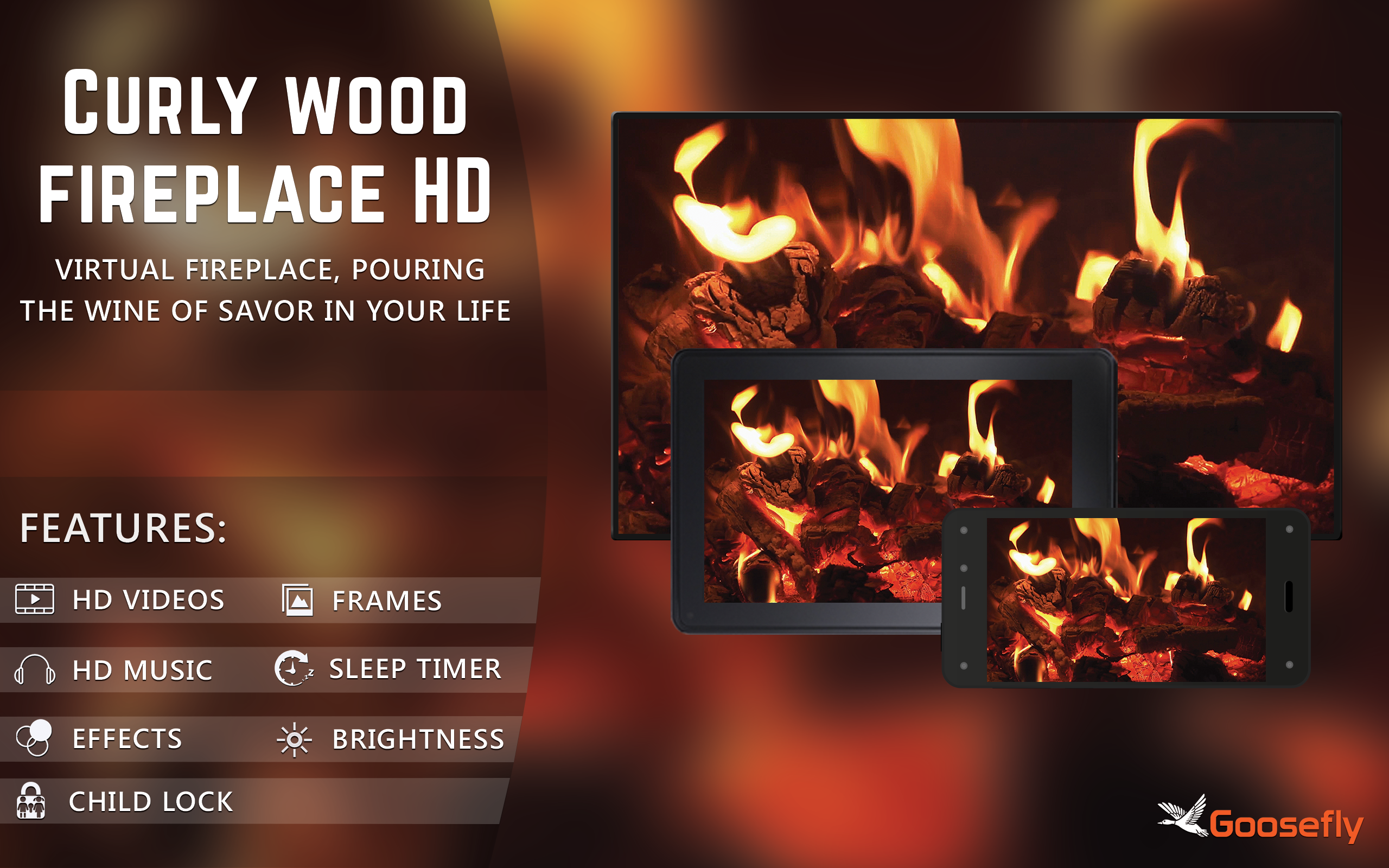 Feel the intense warmth of the fire place in the dark night guarded by the frigidity of the environment, sending out its warmness with the crispy crackling noise of the burning wood. The curly sturdy small wooden logs are expiring their life on the behalf of warming the environs against dead chill surroundings. This virtual fireplace app will let you to fill the absence of fireplace in your home. In addition to this, the dulcet default music and custom music of your choice will give cherishment when played as the background music. Five different frames will give a graceful look to your screen during running of this app on your screen. Different screen effects in this app will multiplies the level of your enjoyment. Sleepy effects of the app will be aided by the sleep timer that will enable turning the app off automatically as required by the user. Just download this wonderful app and have a nice piece of enjoyment for you winters.