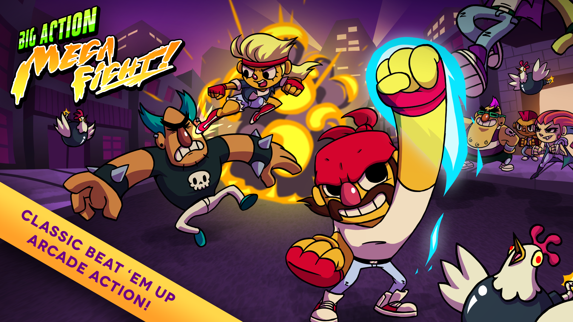 Big Action Mega Fight! is a classic-style beat 'em up/brawler game with a modern twist! Hilarious arcade fighting meets high-score action frenzy.