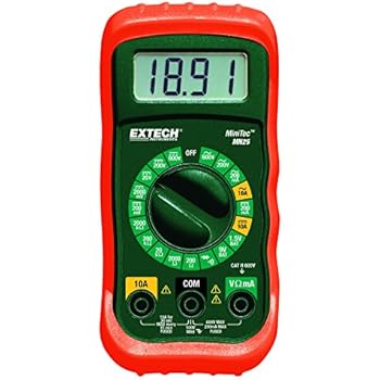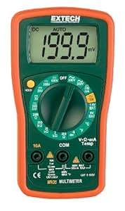 Conveniently sized Extech MN35 manual-ranging multimeter enables you to measure AC and DC voltage up to 600 Volts. It is designed with a large, easily readable LCD screen. Unit also provides resistance tests with continuity and diode functions, thermocouple temperature measurements up to 1400deg F and a data hold function that locks the reading on the display. Compact multimeter is ergonomically designed with curved corners. Features an integrated tilt stand and impact-resistant rubber holster for excellent grip and protection. Includes 9V battery, test leads, Type K thermocouple probe and instructions. DC Volts: 600, Accuracy: 0.5% DCV, 1.2% ACV, 1.5% DC current @ 200mA, Amps: 10, Functions (qty.): 8, Application: DC current, DCV, ACV, resistance, temperature, continuity/diode, Dimensions L x W x H (in.): 5 7/16 x 2 13/16 x 1 1/2, AC Volts: 600, Low Battery Indicator: Yes, Display Shows: 2,000 count