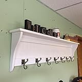 Coat Rack Wood Country Wall Shelf White 53" Wide Display Wall Shelf Hanging Antique Iron Hooks