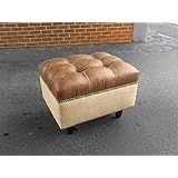 24" Tufted Distressed Vegan Leather and Burlap Ottoman | Artisan Made in the USA …