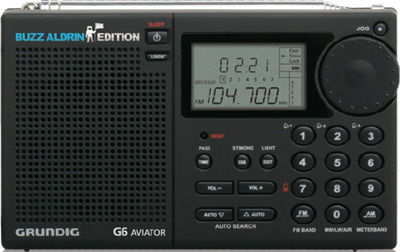 This is a version of the G6 that is endorsed by Dr. Buzz Aldrin, Apollo 11 astronaut, as a celebration of America's 50 years of space exploration. With the Grundig G6 Aviator at your side, youll always have great listening options. Tune in to AM, FM, aircraft band or shortwave frequencies easily with direct keypad entry. Use the multiple tuning features to quickly scan or browse stations. This portable radio only weighs about 7 ounces, so you can always have your favorite stations at hand. The international clock and wake-up alarms keep you on schedule, wherever your travels take you.