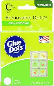 Removable Glue Dots are double sided adhesives that bond instantly to most clean, dry surfaces. Glue Dots stay secure and replace messy liquid glues, requiring no drying time. Removable Glue Dots use a lightweight glue formula making a loose bond for transitional projects. Unlike tapes and putties, Removable Glue Dots can be removed easily without staining or leaving behind a sticky residue. These Dots are acid and lignin free, non-toxic, and photo safe. They bond easily, the pressure sensitive dots are perfect for the office, school and home. They also adhere to paper, vellum, fabric, wood, foam, plastic and more! They are ideal for kids, with no fumes, no mess and no drying time. Package contains 200 Dots, 3/8 inch diameter.