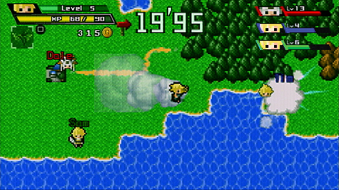 I really like the graphics. They're pixelly and 8-bit, and while the characters are SO blocky you can barely tell what they look like, this is on purpose. The parts of the graphics that are 'permitted' to look more fashionable most definitely do, though! The maps look nice (though they're pixelly as well), and the scenes are pretty artistic. The animation has nice easing and certain things such as projectiles are visually appealing. One thing I definitely did not like, though, was the layout and where certain things such as health bars and mana gauges were located. Oftentimes you'll find yourself completely ignoring everything except these gauges, and you'll end up paying for it later on. Making the health bars closer to the center of the screen, or making a mana gauge easier to read would have made the gameplay flow much better. Stylistically, though, it's consistent, but I hate the font that's used, as the lower case Os and As are extremely hard to tell apart from each other. There are also complaints that the menu looks too plain, but personally I like it; the style is simple, sure, but it looks like it's from an independent developer, which makes it seem 'cozy' to me.