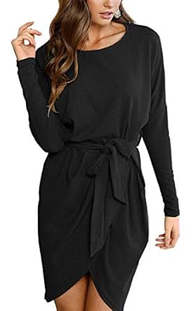 - Style:Sexy,Round neck and long sleeve,Relaxed fit long sleeve dress,batwing style sleeves,cross over front skirt with raised hem,Self fabric waist tie,Soft stretchy jersey like fabric,Very suitable for autumn and winter season