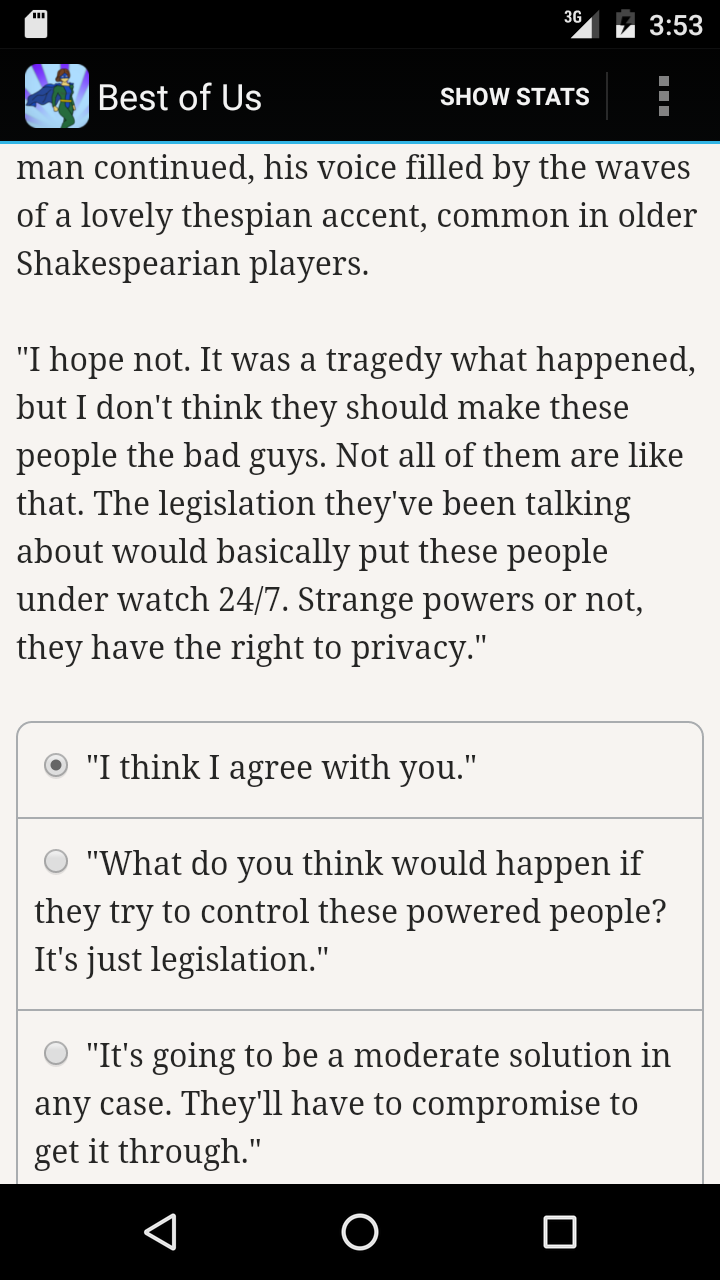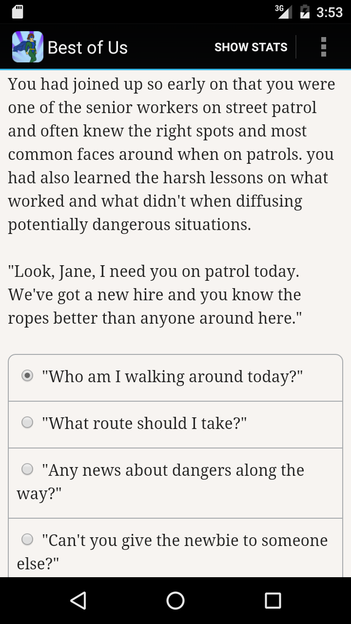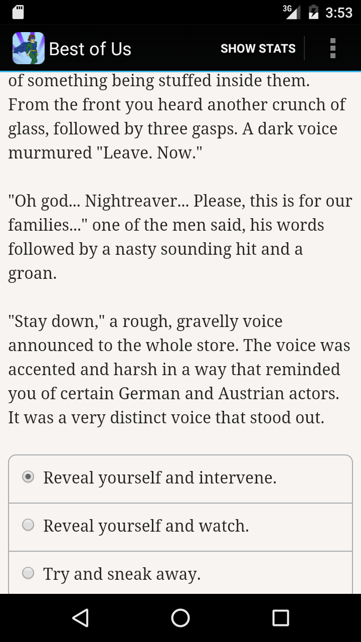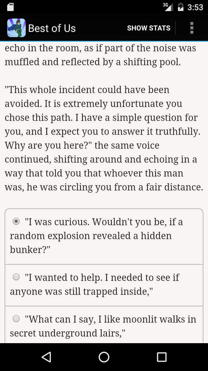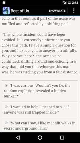 "The Best of Us" is an interactive novel by Teo Kuusela, where your choices control the story. It's entirely text-based--127,000 words, without graphics or sound effects--and fueled by the vast, unstoppable power of your imagination.