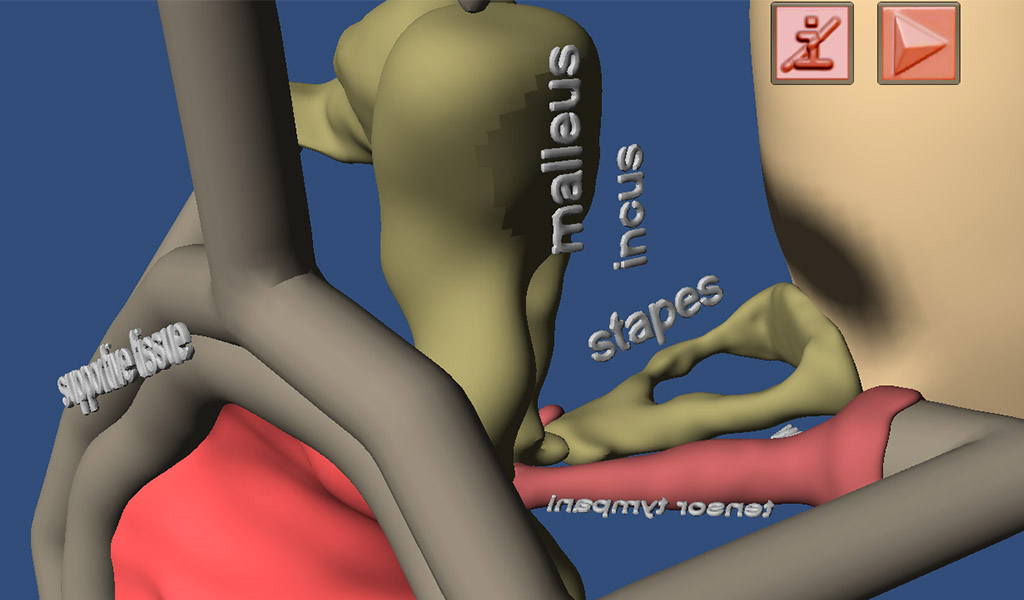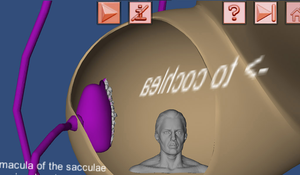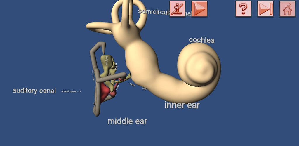 Human ear organ has a complex structure and function, its crucial parts lying deep in the temporal bone. Therefore it is difficult to understand it, especially its sound frequency coding. One cannot really comprehend this without interacting with it in 3D virtual reality - made possible here in this free application. There are several fully spatially interactive scenes, explaining the transduction of the sound to vibrations in the middle ear, the distribution of vibration in the inner ear and the way of the frequency coding. Finally the vestibular system with the sense of equilibrium is explained. This project is intended for secondary schools and universities, for students to understand easier and faster and of course for teachers to use it in order to make their presentations more attractive and content richer.