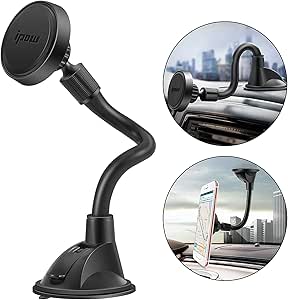 IPOW Long Arm Universal Magnetic Cradle Windshield Dashboard Cell Phone Mount Holder with 4 Metal Plates, Soft Firm Goose Arm and Enhanced Suction Cup