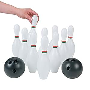 This sturdy plastic bowling set has 10 all white pins and 2 black bowling balls. The pins are 8" high and the balls are 4" round. Very durable. Youngsters can enjoy playing with this set for many hours.