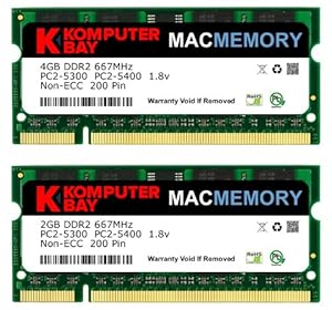 • Komputerbay MACMEMORY 6GB Kit (4GB + 2GB Modules) PC2-5300 667MHz DDR2 SODIMM for Apple MacBook Pro early 2009 MacBook 5,2 2.0GHz