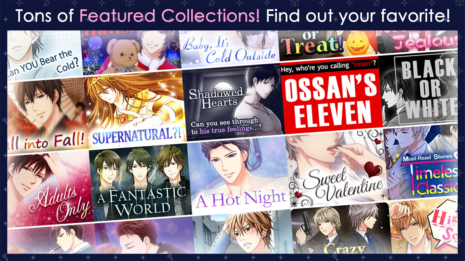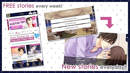 Over 5,000 episodes, stories, and situations! Experience heart-melting first kisses, passionate nights, or even explosive adventure! Your life is about to get a whole lot more exciting!