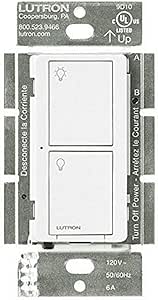 The Lutron pd5wsdvwh is an in wall on/off switch from the Caseta wireless line of control products. It's compatible with many different load types, including 600W incandescent and ELV loads, 600Va MLV loads, 5a LED/CFL lighting loads, and 3a general purpose fans. The Caseta line uses 434 MHz communications to operate. This Lutron Caseta in wall light switch features a fast installation that usually takes about 15 minutes. It comes in a white finish and mounts easily on the wall, perfect for retrofit applications. Once installed, it provides easy control over the lighting, Fan, or other load in the room through its 2Button interface. This dimmer uses the clear connect system to wirelessly connect to other Lutron Caseta wireless products. This allows connected lighting to be controlled by the tiny Pico remote, which is sold separately. This remote can also be mounted on the wall and synchronized with this dimmer, allowing for multiple points of access in the room.