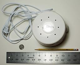 The product is the size and shape of a fat smoke detector. Two things surprised me when I first received it. First, it was quieter than I thought it would be--even the loudest setting seems quieter than a window air conditioner. Even still, my husband complained he wouldn't be able to sleep with "all that noise." (He got used to it within a day or two). It sounds something like a fan--a rush of air. Although you can adjust the volume and tone somewhat, the highest volume is also the highest pitch. Personally I wish it had a deeper tone.