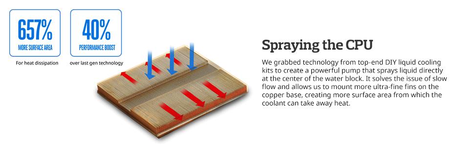 • Zoning in on heat - Liquid is funneled directly at the hottest part of the CPU and carried away quickly through technology normally used in high-end DIY models