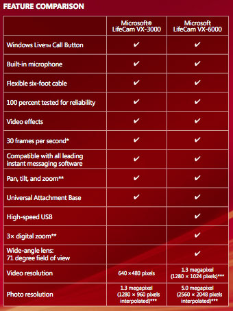 The Microsoft LifeCam VX-6000 is optimized for Windows Live Messenger, which is used by the largest worldwide instant messenger community with over 200 million users. Three key features give you a superior Windows Live Experience. First, the Windows Live Call Button makes it easy to start a video call. Simply press the button to see who's online, and you're on your way to a video call. Second, with the LifeCam Dashboard you can access video effects and control your webcam from the Windows Live Messenger window. Lastly, with One-Touch Blogging, a single click allows you to upload to Windows Live Spaces, an "online scrapbook" that lets you easily post blogs, photo albums, and personal music lists.