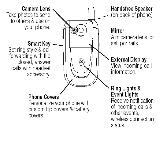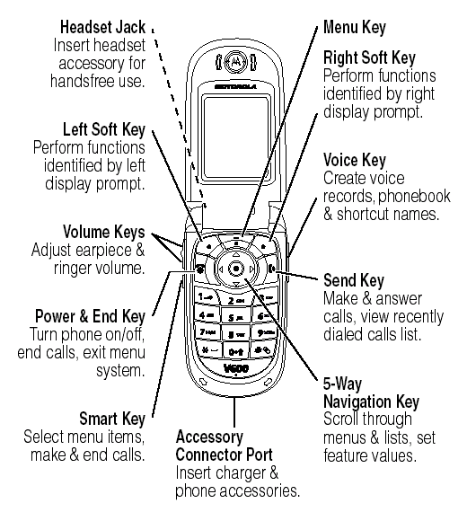 The tri-band Motorola V600 cell phone features Bluetooth connectivity, an integrated VGA digital camera, and MMS with video clip playback. You'll also get "Situational Lights"--a feature that lets you light colors for various types of calls--and much more, all displayed on a large, high-resolution 176 x 220 pixels, 65,000 color interior screen.